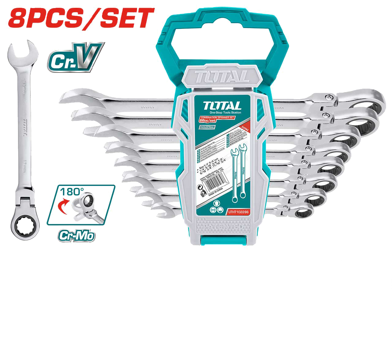 Jogo de 8 chaves combinadas com catraca e articuladas. Medidas de 8 - 10 - 12 - 13 - 14 - 15 - 17 - 19 mm. Fabricadas em Cr-Mo